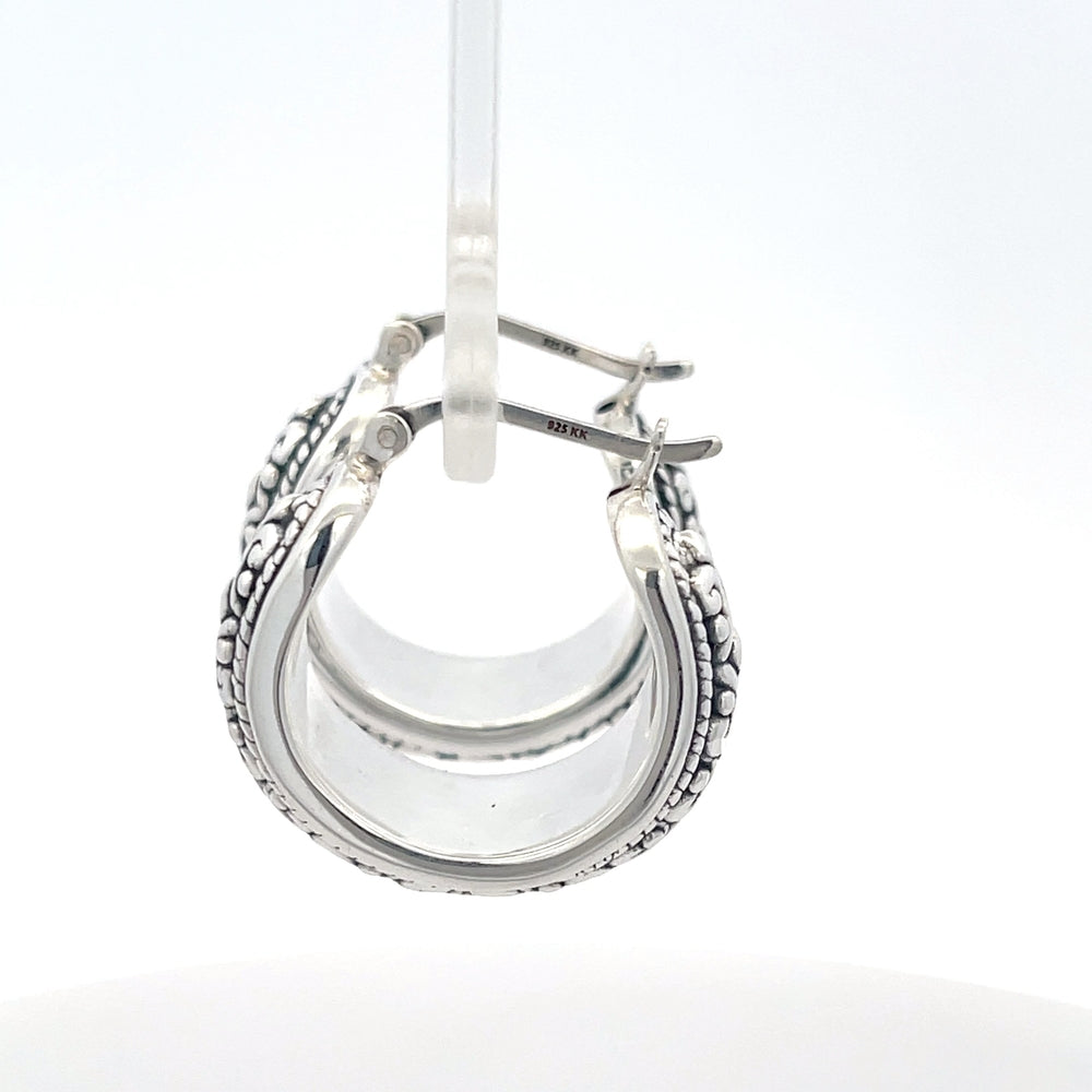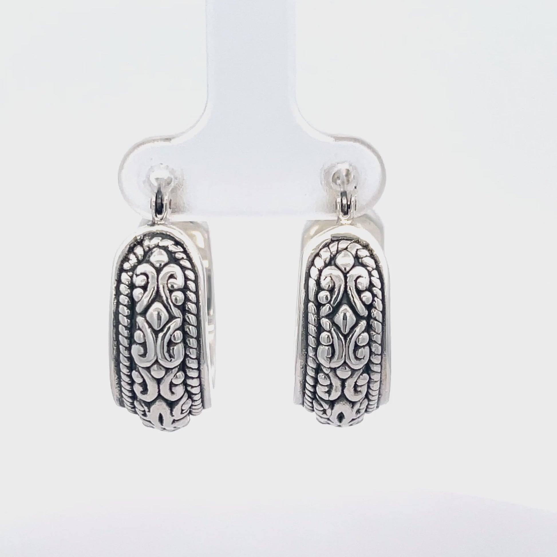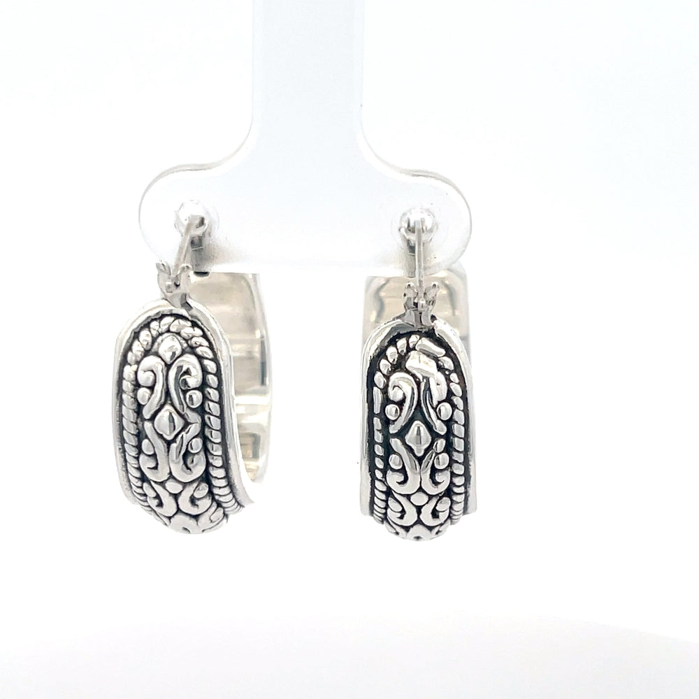 Diese handgefertigten Creolen aus 925er Silber bestechen durch filigrane Muster, die traditionelle Handwerkskunst unterstreichen. Der sichere Verschluss garantiert einen angenehmen Tragekomfort, während die oxidierte Oberfläche das detailreiche Design hervorhebt. Die vielseitigen Ohrringe lassen sich sowohl zu traditioneller als auch zu moderner Kleidung elegant kombinieren.