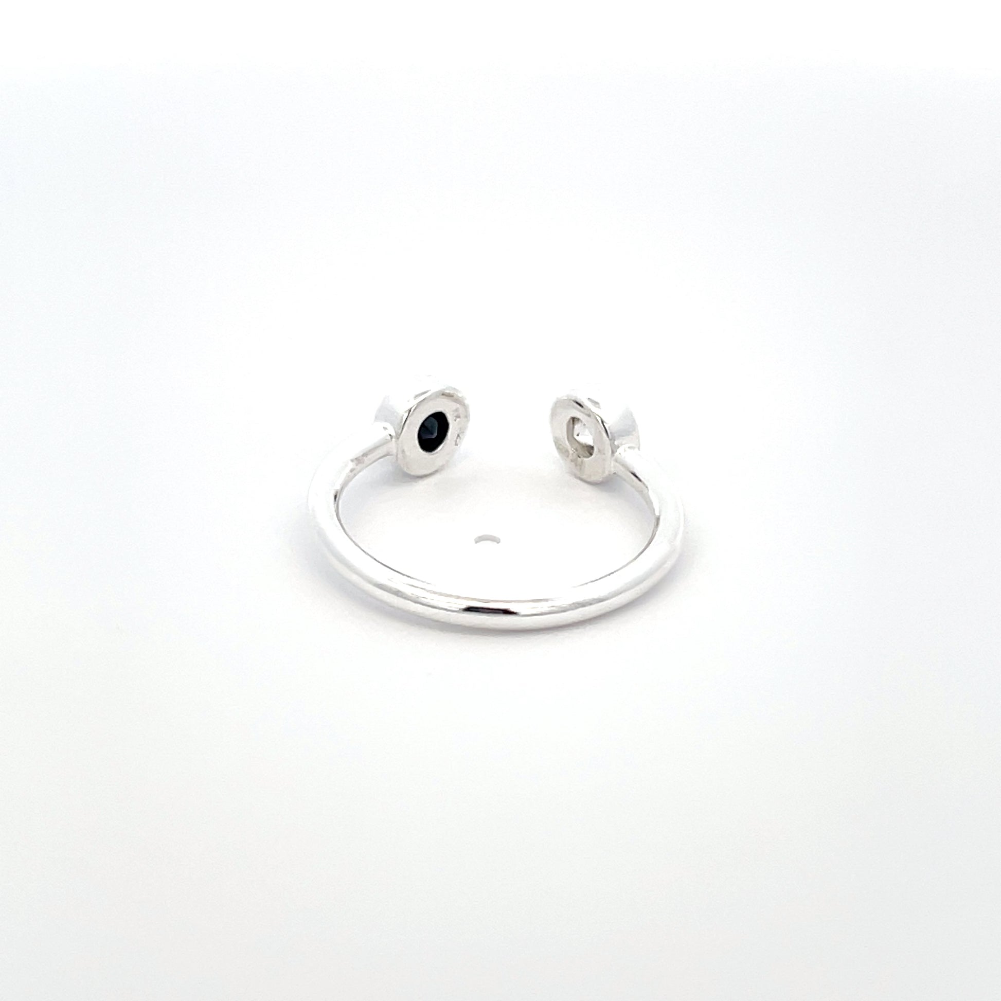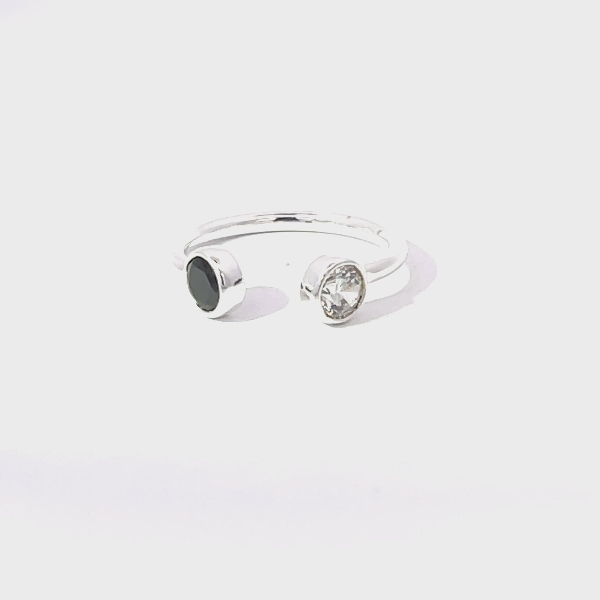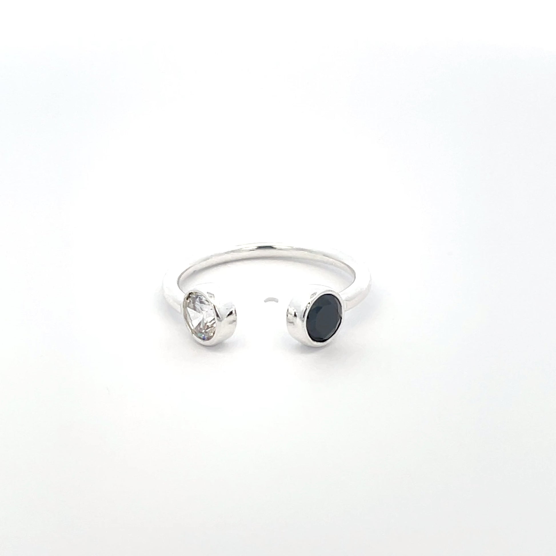 Crafted in 925 silver, this open ring pairs the brilliance of white zircon with the depth of black zircon for a striking contrast. Its open and adjustable design adds comfort while reflecting modern elegance. A chic accessory for young women who love bold, versatile jewelry.